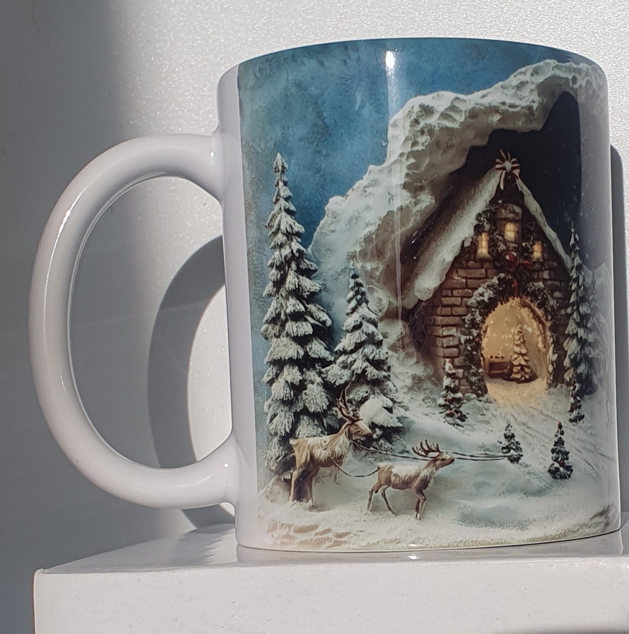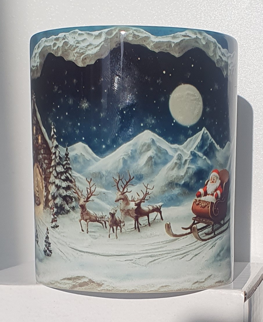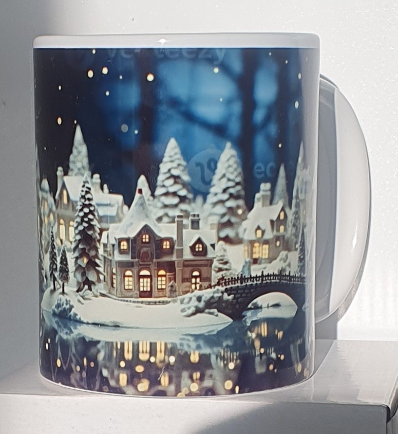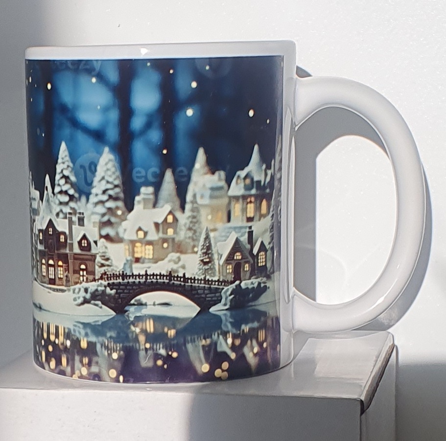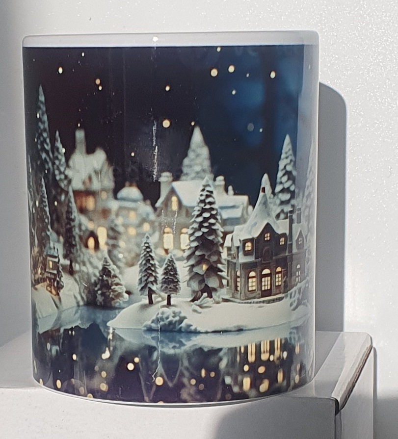 Mug Effet 3D – Bonhomme de Neige Un mug avec un trou 3D réaliste révélant un bonhomme de neige en laine bleu et blanc. Un design surprenant et magique pour l’hiver.