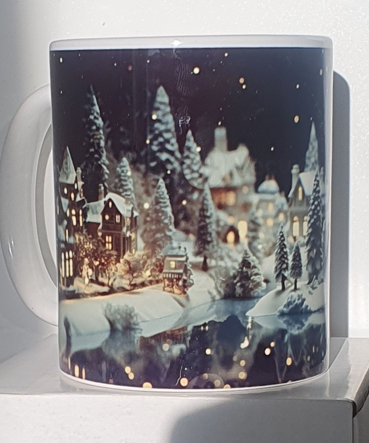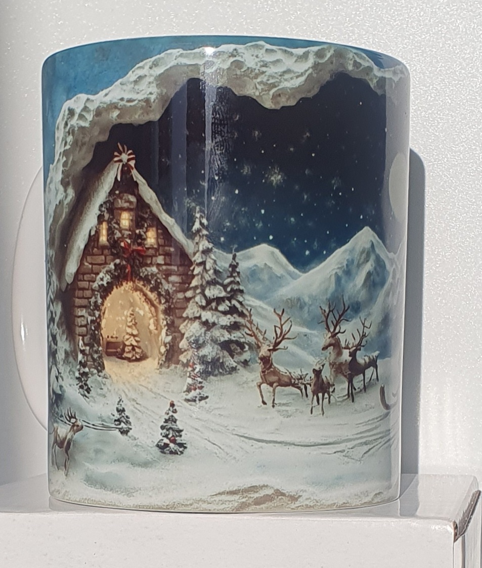 Mug Effet 3D – Bonhomme de Neige Un mug avec un trou 3D réaliste révélant un bonhomme de neige en laine bleu et blanc. Un design surprenant et magique pour l’hiver.