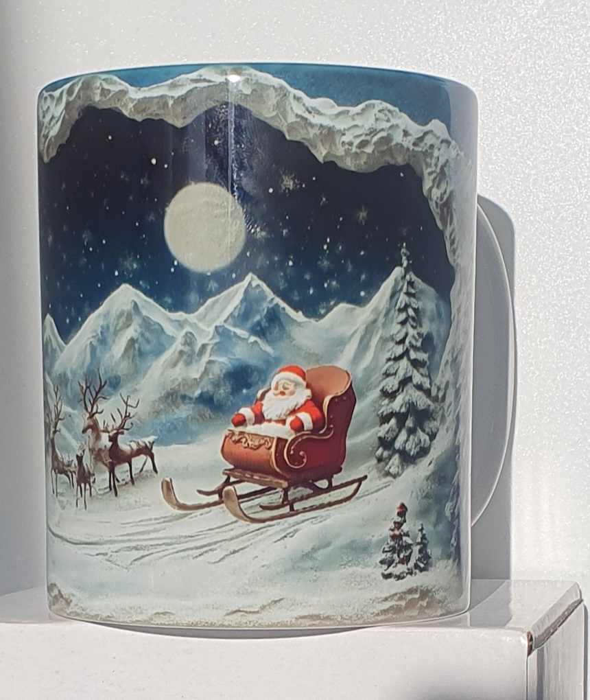 Découvrez un mug original et étonnant mettant en scène une tête de Père Noël entièrement verte, une version réinventée du célèbre personnage, tout en conservant son charme festif. Autour de lui tourbillonnent de délicats flocons de neige, créant une ambiance hivernale douce et magique.
